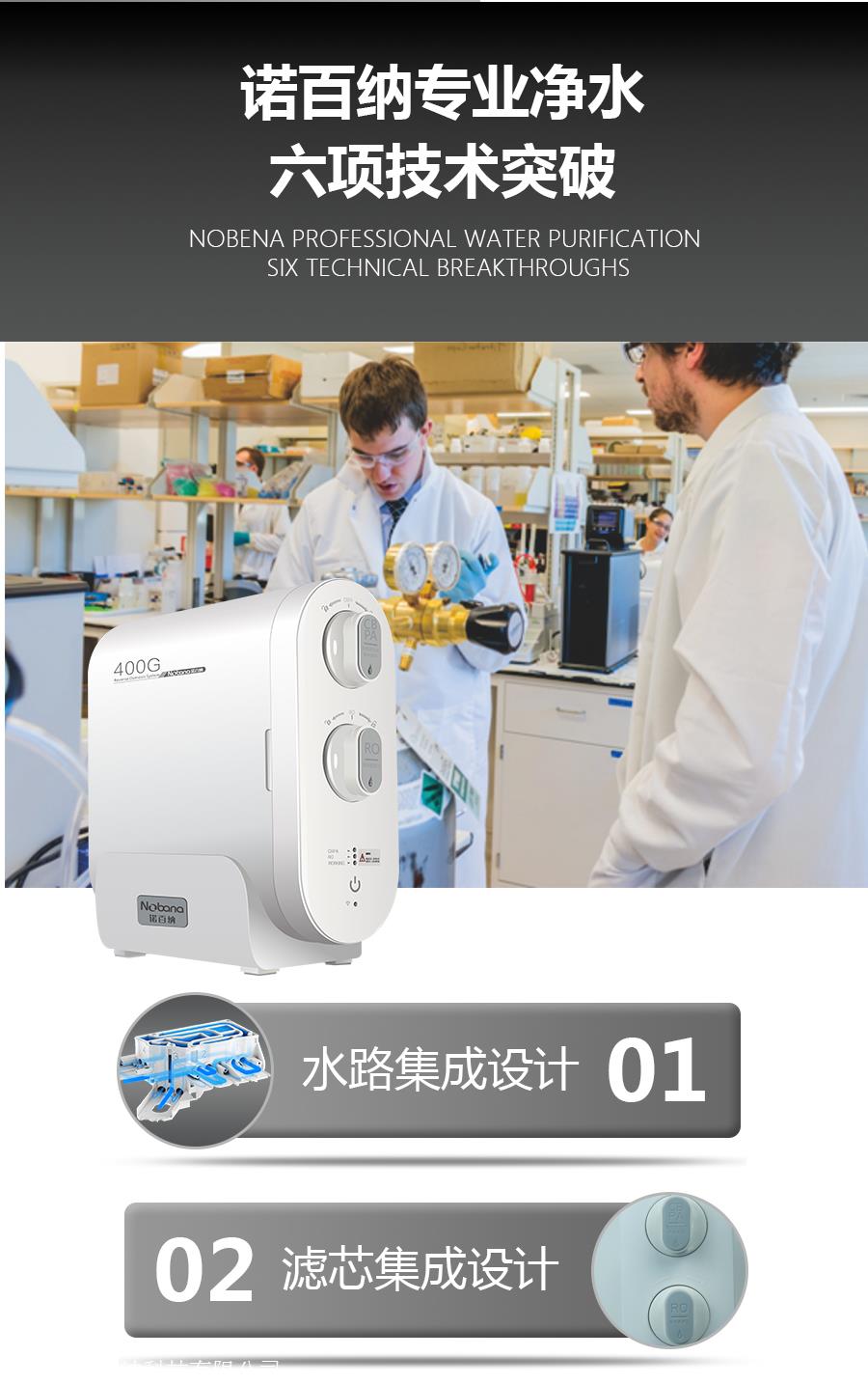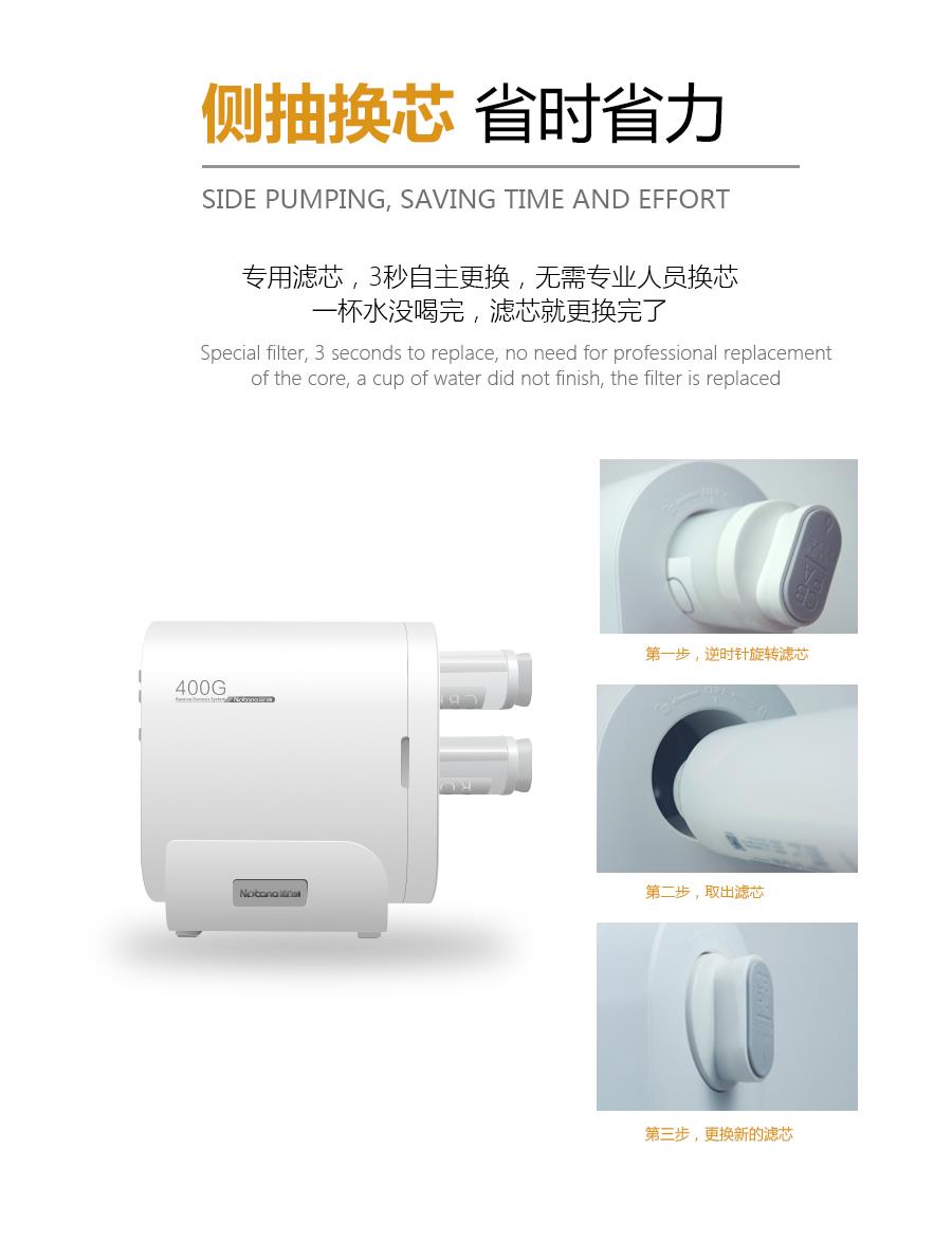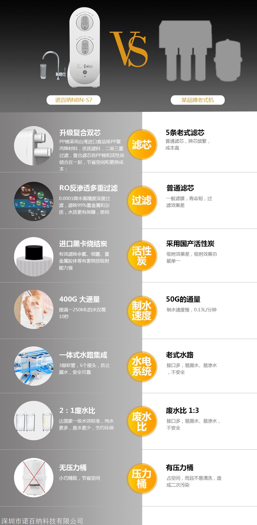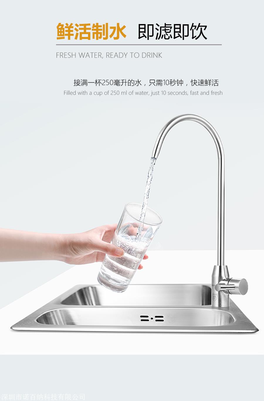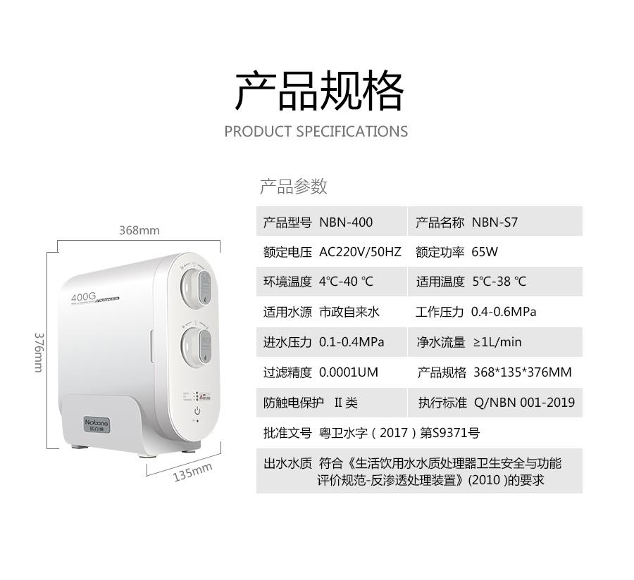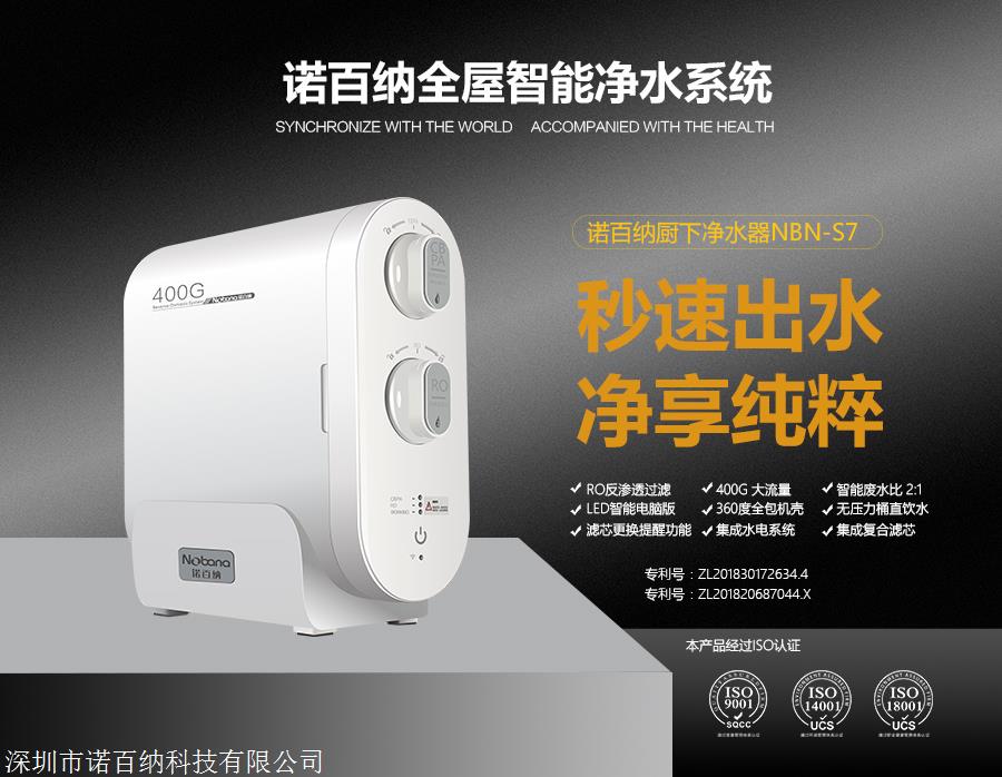 产品详情:诺百纳厨下净水器NBN-S7秒速出水清可纯的,用到RO反渗透滤膜,400g大流量,智能废水比率2:1,led智能电脑版,360度全包式外壳,无须压力即可直接饮水桶,智能提醒机能,用以更换滤芯,采用集成的水电系统,集成复合滤芯。