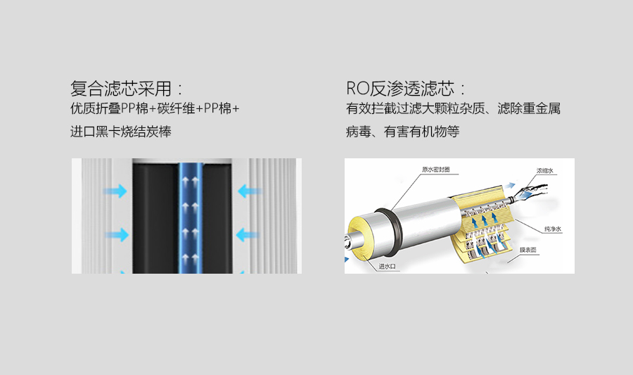 1.滤芯配置:复合滤芯(可折叠PP棉+进口黑卡烧结碳棒)+ro膜